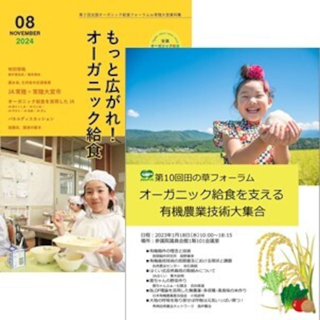 『第10回田の草フォーラム オーガニック給食を支える有機農業技術大集合』の講演全編のアーカイブ動画と資料集、第2回全国オーガニック給食フォーラムの資料集のセットです。