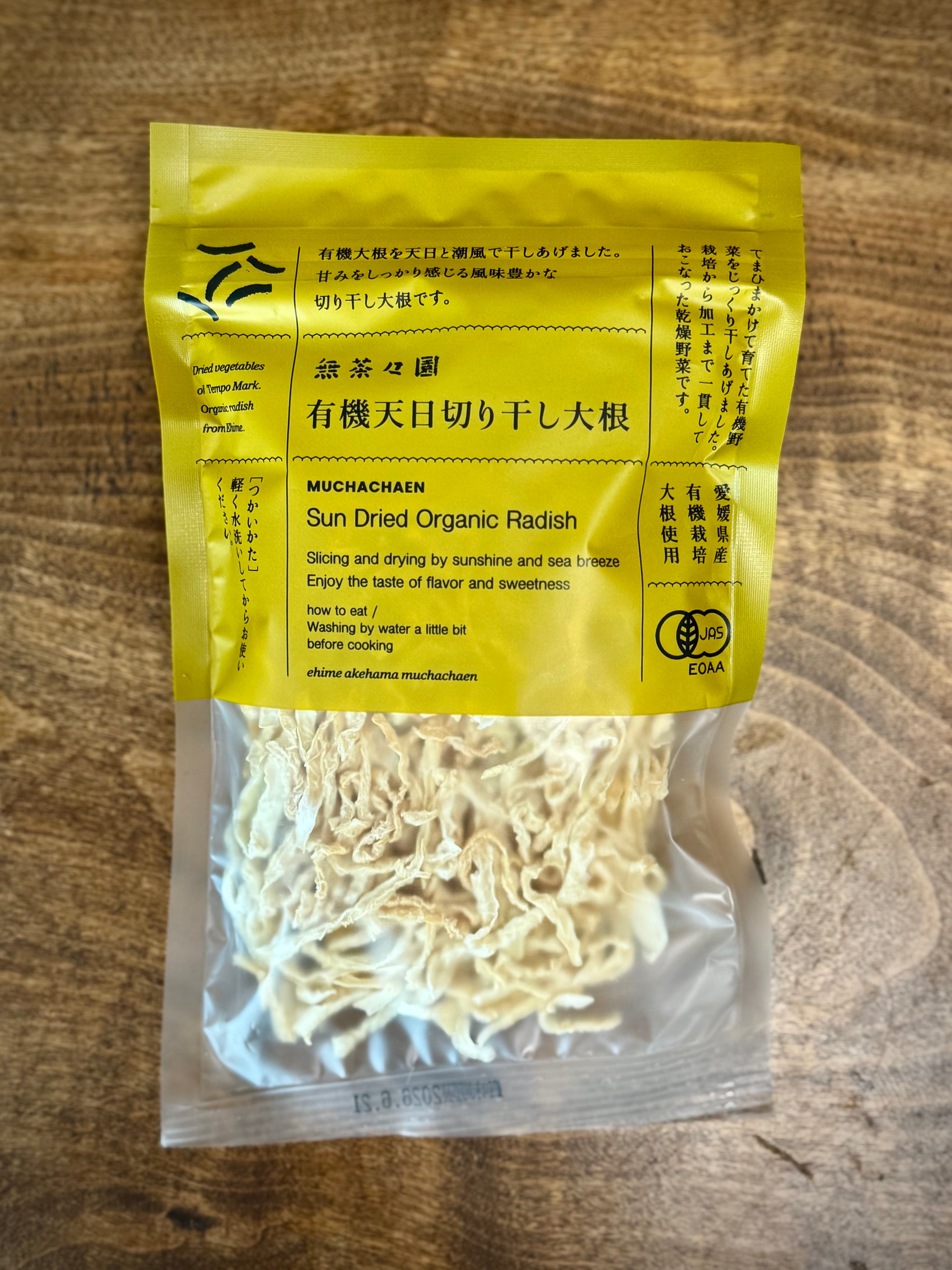 山上の北条風早園地で育てた有機大根を、海辺のまち明浜町まではるばる運んで天日と潮風で干しあげました。甘みをしっかり感じる風味豊かな切り干し大根です。原料約700g分の有機大根が、乾燥後35gに凝縮されています。